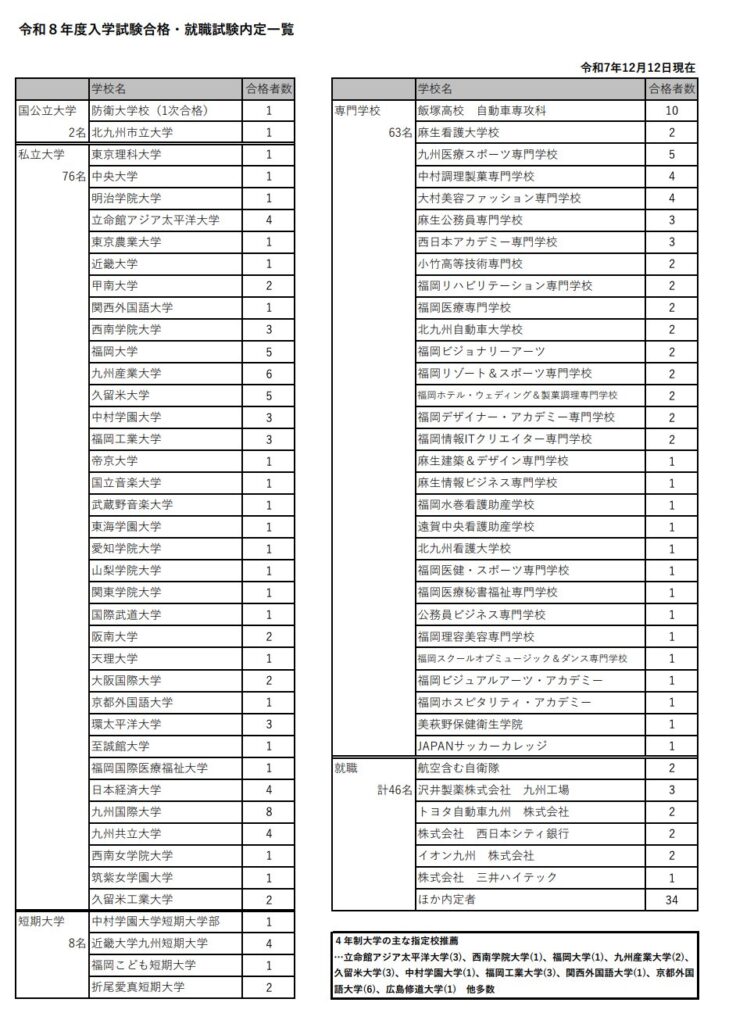 飯塚高校では、2026年3月に卒業予定の生徒たちの現時点(令和7年12月12日現在)での進路決定状況を取りまとめましたので、お知らせします。