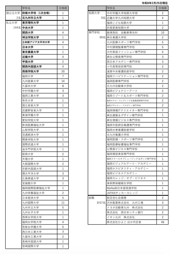 飯塚高校では、2026年度入学試験・就職試験の進路決定状況(令和8年2月25日現在)を公開しました。